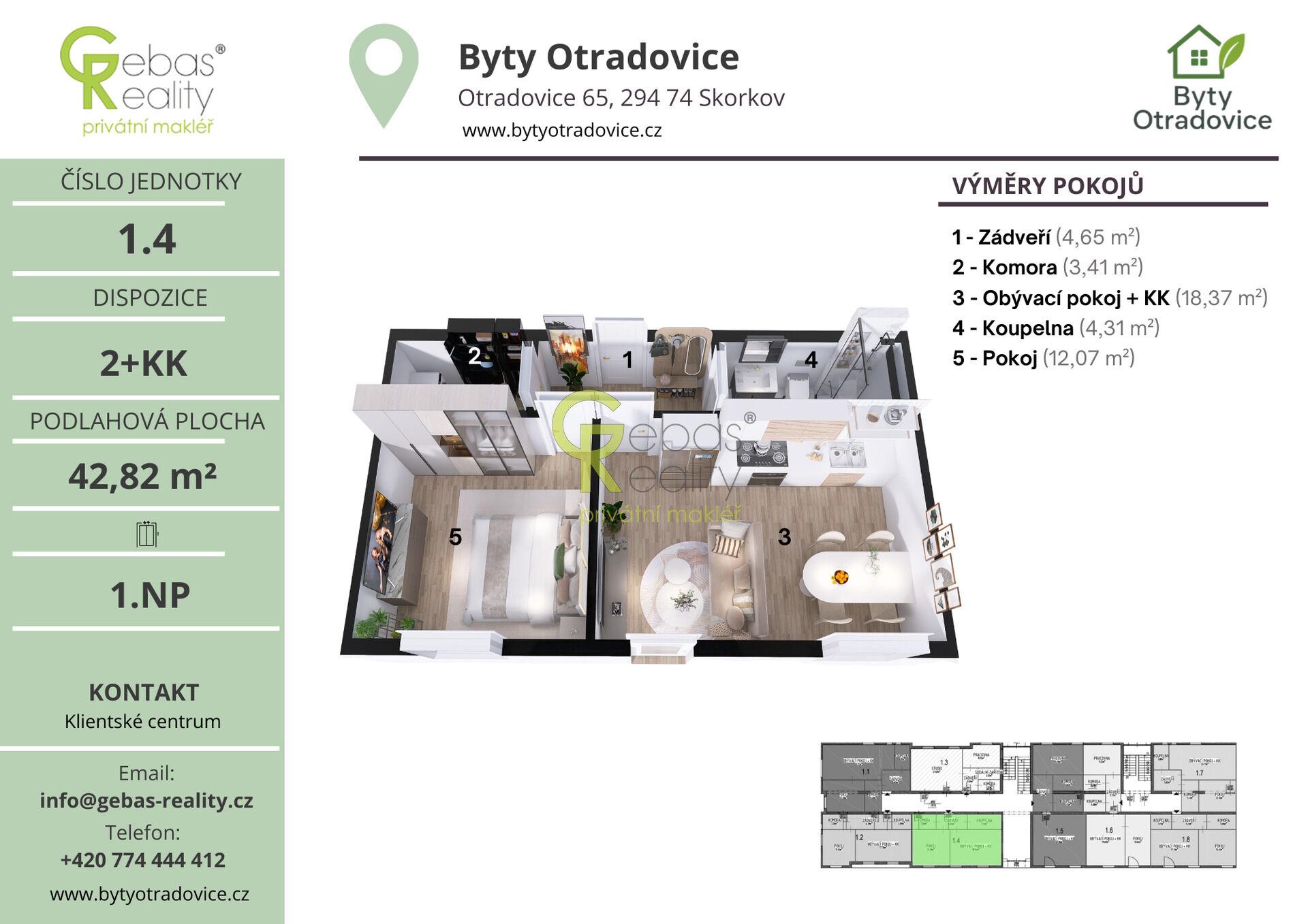 Ve výhradním zastoupení si Vás dovolujeme oslovit nabídkou moderní bytové jednotky o dispozici 2+KK a celkové užitné ploše 42,8 m², která se nachází v kompletně zrekonstruovaném bytovém domě v obci Otradovice – Skorkov pouhých 5 minut od Brandýsa nad Labem – Staré Boleslavi. Projekt Byty Otradovice zahrnuje celkem 16 bytových jednotek různých velikostí a nabízí kvalitní a komfortní bydlení v klidné lokalitě s výbornou dostupností do Prahy, Brandýsa nad Labem – Staré Boleslavi i Mladé Boleslavi. Součástí kupní ceny je parkovací stání před domem, kuchyňská linka vyrobená na míru od truhláře včetně vestavných spotřebičů, kompletní sanita v koupelně značky JIKA a zděný sklep o minimální ploše 15 m² umístěný v suterénu domu. Byty jsou navrženy s důrazem na moderní standardy a praktické využití prostoru. Samozřejmostí je podlahové vytápění napojené na tepelné čerpadlo voda–vzduch, digitální Wi-Fi termostat, vinylové podlahy v dekoru dřeva a sádrokartonové podhledy s vestavěným osvětlením, velkoformátová dlažba a obklady v koupelně. Okna s trojskly ve dvojím dekoru. Interiérové dveře včetně kování značky SAPELI doplňují bezpečnostní protipožární vstupní dveře. V koupelnách bytových jednotek kompletní sanita se skleněným sprchovým koutem a topným žebříkem a přípravou pro pračku i sušičku. U bytového domu pro majitele bytových jednotek k dispozici nabíječka na elektroauta a venkovní mycí box pro kola. Dokončení projektu je plánováno na prosinec 2026. Již od února 2026 bude k dispozici plně vybavený vzorový byt, který si bude možné osobně prohlédnout.Přiložené vizualizace mají orientační charakter a zhotovitel usiluje o to, aby se výsledná realizace co nejvíce shodovala s jejich podobou . Bytový dům je situován v přírodě, obklopen lesy, a poskytuje tak příjemné a klidné prostředí pro život. Sousední skladový areál bude navíc odstíněn přírodní zelenou zástěnou, jak je patrné z přiložených vizualizací. Byty Otradovice představují ideální příležitost pro ty, kteří hledají moderní bydlení v zeleni s rychlou dostupností města, ať už pro vlastní potřebu, nebo jako zajímavou investici. Pro více informací či sjednání prohlídky nás neváhejte kontaktovat. (PENB – C)