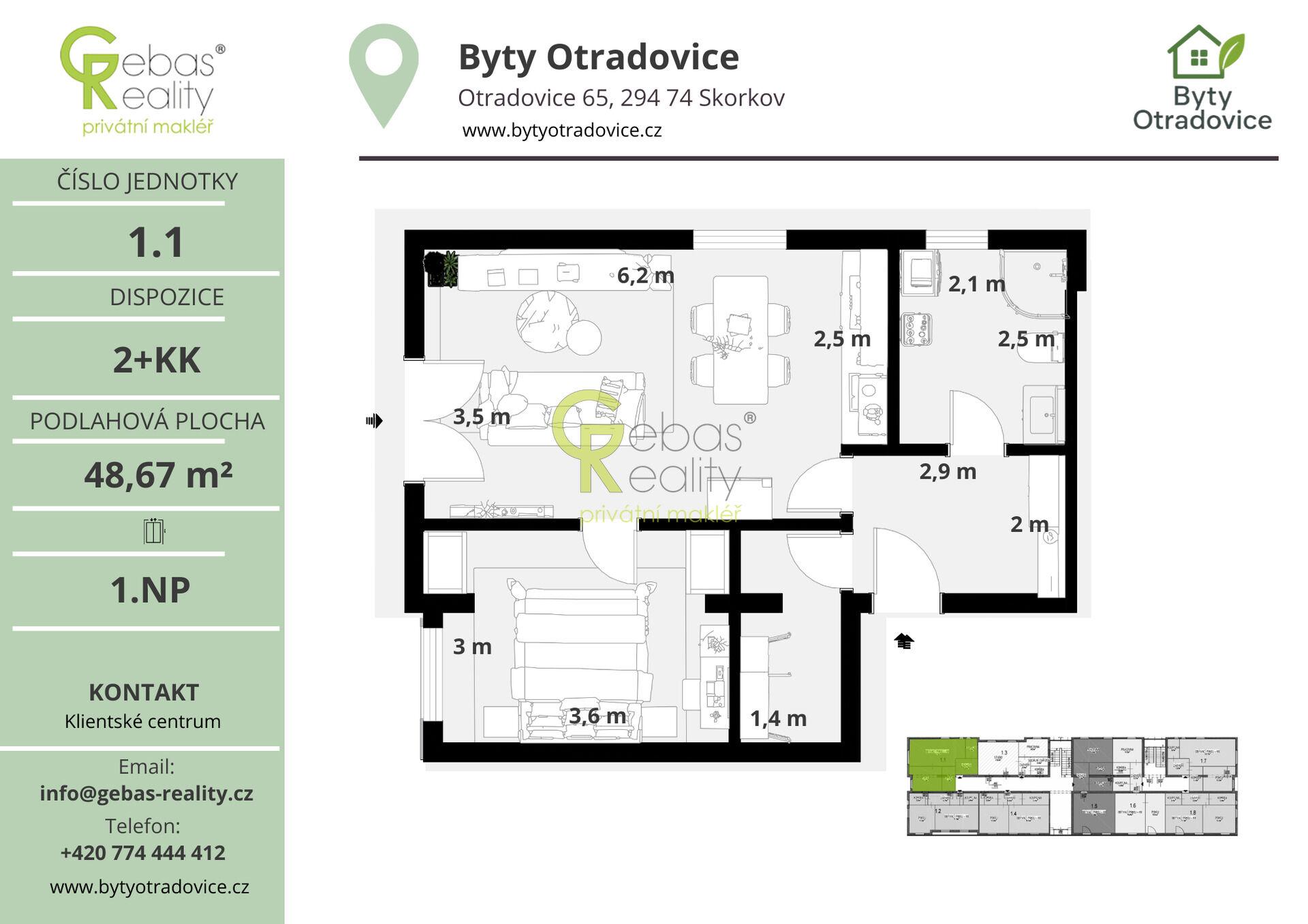 Ve výhradním zastoupení si Vás dovolujeme oslovit nabídkou moderní bytové jednotky o dispozici 2+KK a celkové užitné ploše 51,1m², která se nachází v kompletně zrekonstruovaném bytovém domě v obci Otradovice – Skorkov pouhých 5 minut od Brandýsa nad Labem – Staré Boleslavi. Projekt Byty Otradovice zahrnuje celkem 16 bytových jednotek různých velikostí a nabízí kvalitní a komfortní bydlení v klidné lokalitě s výbornou dostupností do Prahy, Brandýsa nad Labem – Staré Boleslavi i Mladé Boleslavi. Součástí kupní ceny je parkovací stání před domem, kuchyňská linka vyrobená na míru od truhláře včetně vestavných spotřebičů, kompletní sanita v koupelně značky JIKA a zděný sklep o minimální ploše 15 m² umístěný v suterénu domu. Byty jsou navrženy s důrazem na moderní standardy a praktické využití prostoru. Samozřejmostí je podlahové vytápění napojené na tepelné čerpadlo voda–vzduch, digitální Wi-Fi termostat, vinylové podlahy v dekoru dřeva a sádrokartonové podhledy s vestavěným osvětlením, velkoformátová dlažba a obklady v koupelně. Okna s trojskly ve dvojím dekoru. Interiérové dveře včetně kování značky SAPELI doplňují bezpečnostní protipožární vstupní dveře. V koupelnách bytových jednotek kompletní sanita se skleněným sprchovým koutem a topným žebříkem a přípravou pro pračku i sušičku. Přiložené vizualizace interiéru znázorňují návrh možného vzhledu interiérů bytových jednotek projektu Byty Otradovice. Slouží jako předloha a inspirace, jak může výsledné provedení působit po dokončení. Developer potvrdil záměr realizovat interiéry v obdobném stylu a barevném dekoru a dle uvedených standardů. U bytového domu pro majitele bytových jednotek k dispozici nabíječka na elektroauta a venkovní mycí box pro kola. Dokončení projektu je plánováno na prosinec 2026. Již od února 2026 bude k dispozici plně vybavený vzorový byt, který si bude možné osobně prohlédnout.Přiložené vizualizace mají orientační charakter a zhotovitel usiluje o to, aby se výsledná realizace co nejvíce shodovala s jejich podobou . Bytový dům je situován v přírodě, obklopen lesy, a poskytuje tak příjemné a klidné prostředí pro život. Sousední skladový areál bude navíc odstíněn přírodní zelenou zástěnou, jak je patrné z přiložených vizualizací. Byty Otradovice představují ideální příležitost pro ty, kteří hledají moderní bydlení v zeleni s rychlou dostupností města, ať už pro vlastní potřebu, nebo jako zajímavou investici. Pro více informací či sjednání prohlídky nás neváhejte kontaktovat. (PENB – C)